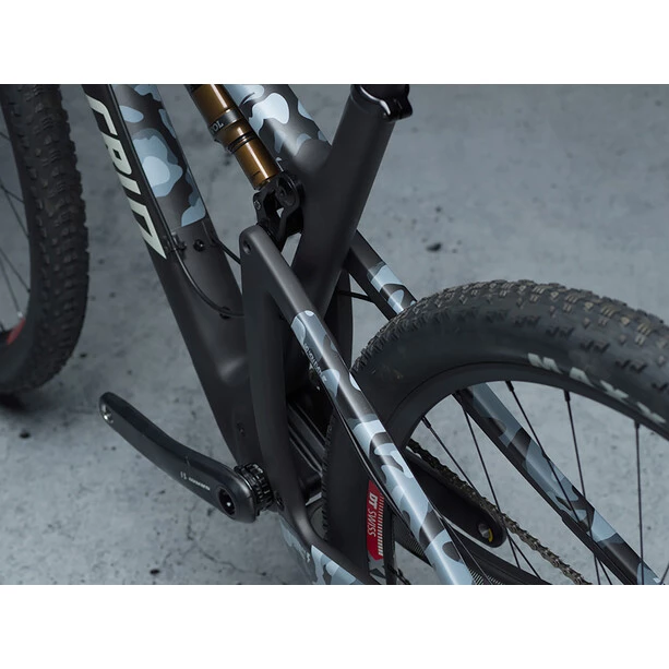 Protecteur de cadre avec motif camouflage imprimé. Le protecteur est transparent, de sorte que vous pouvez toujours voir la couleur de votre vélo en dessous.